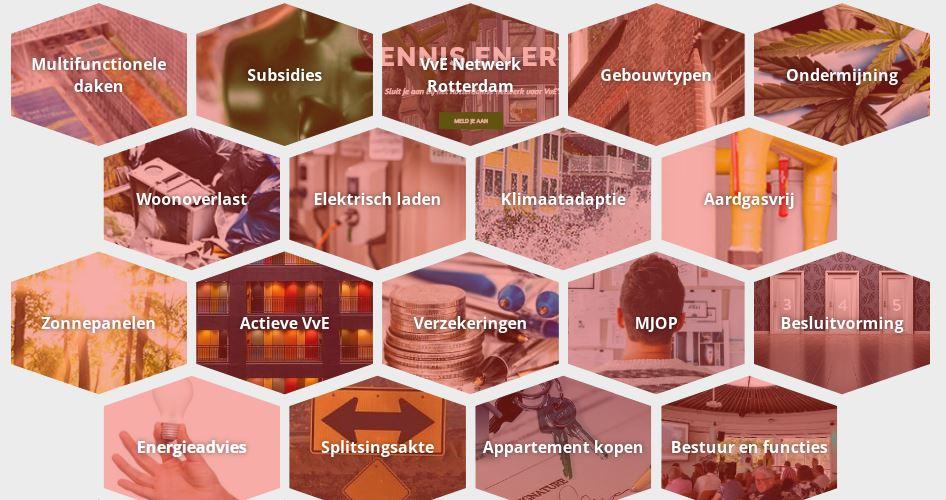De afgelopen maanden zijn meerdere nieuwe themapagina's gemaakt: 'Actieve VvE', 'Bestuur en functies', 'Besluitvorming', 'Splitsingsakte', 'MJOP', 'Energieadvies', 'VvE-bijdrage', 'Appartement kopen', 'Verzekeringen' en 'Optoppen'. Op deze pagina's staat beknopt relevante informatie over het onderwerp, met eventueel filmpjes en downloads. Nieuwsberichten over het onderwerp op onze website komen automatisch op de themapagina terecht. De nieuwe pagina's zijn een aanvulling op de reeds bestaande themapagina's en nodig voor de nieuwe opzet. Andere themapagina's zijn nog in voorbereiding.